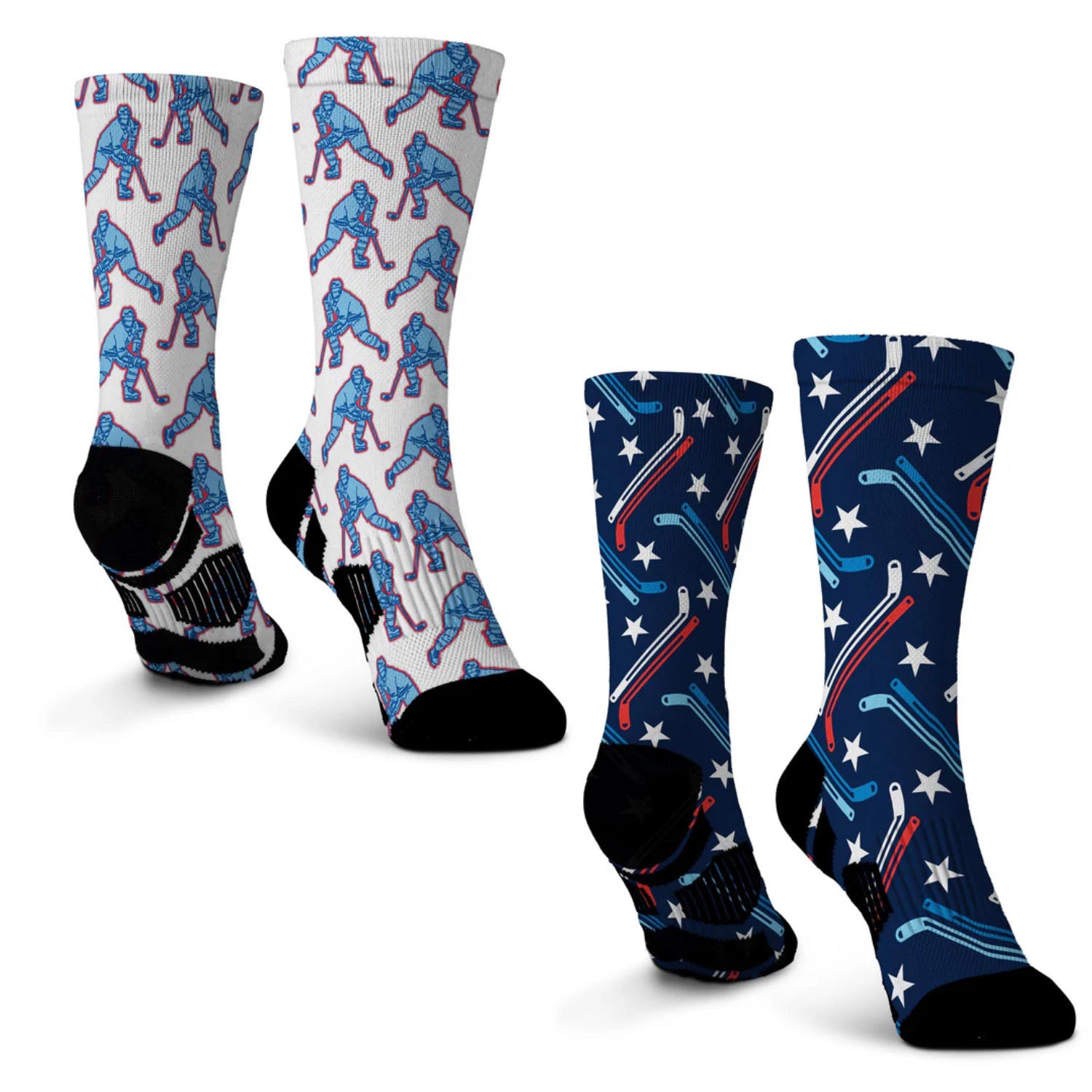 These hockey crew socks are a great way to show off your love of the game year-round! Stay comfortable without sacrificing performance or style with our moisture-wicking material blend and our exclusive hockey designs! Our hockey-themed socks are great gifts for the hockey fan or players in your life or a statement accessory you can wear any time!