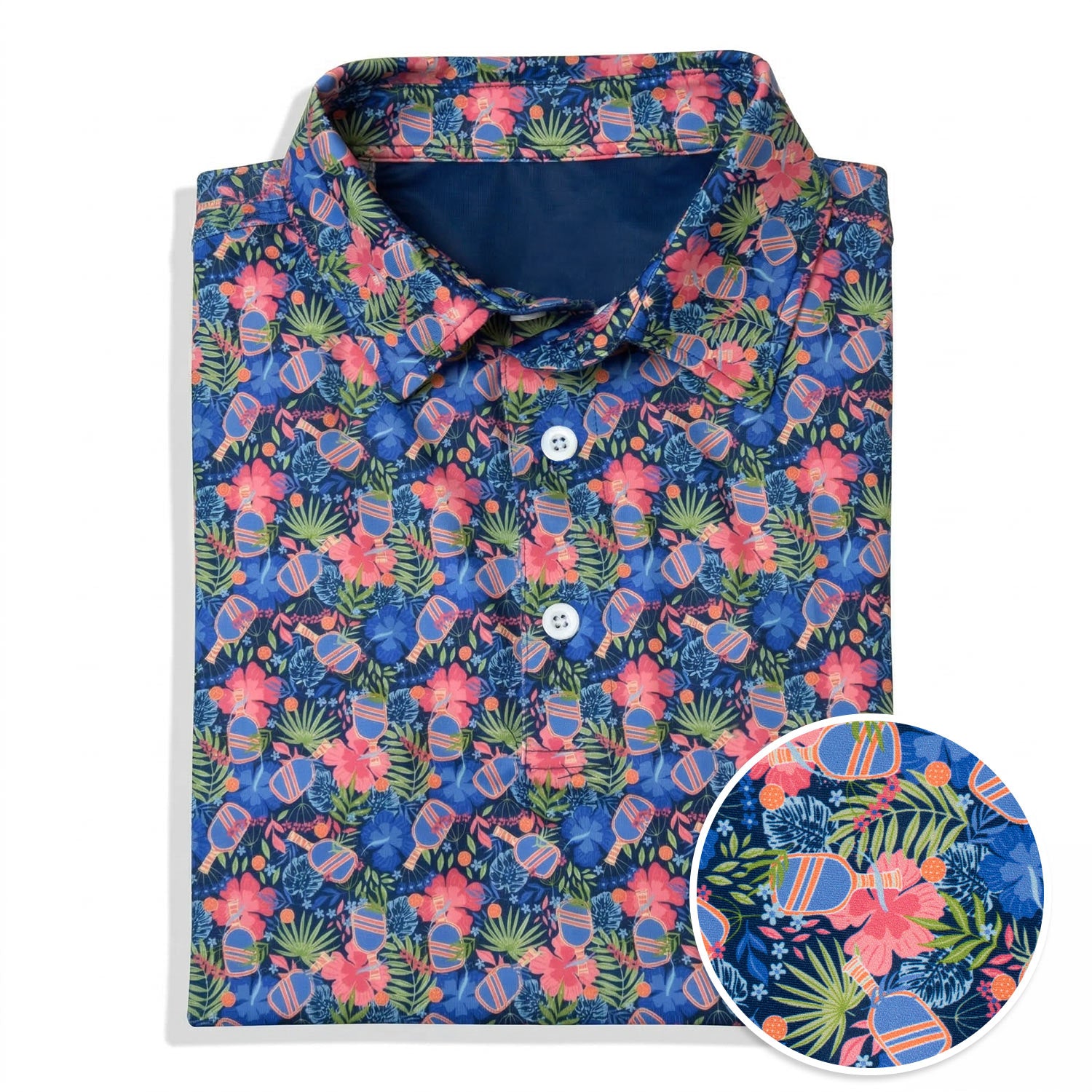 Bring island vibes to the court with this Pickleball Aloha Short Sleeve Polo. Featuring a vibrant tropical-inspired design with pickleball-themed icons woven throughout, this polo blends laid-back beach style with the fun, fast-paced energy of the game. Palm leaves, bright colors, and paddle and pickleball graphics create a lively all-over pattern that stands out whether you're on the court, at a tournament, or enjoying a sunny day. Made with lightweight, breathable fabric and finished with a classic polo collar, it offers all-day comfort with a polished, sporty look. It’s the perfect way to combine your love for pickleball with relaxed tropical style.